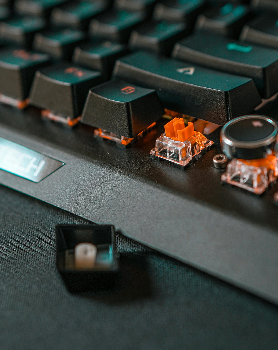black computer keyboard, close-up photo, mechanical keyboard, exposed switches, tactile design, visual design, keyboard switches, black keyboard, close-up keyboard, keyboard features, orange switches