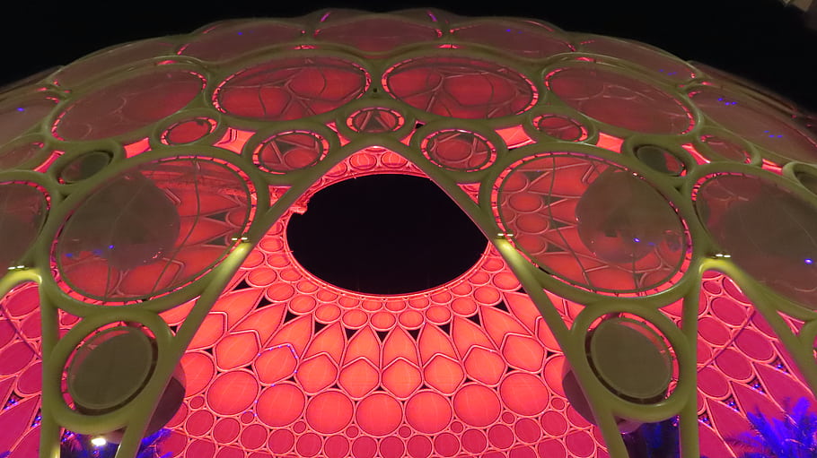 Dubai Expo, 2020, Dubai, 2021, Winter, 2021-2022, architectural design, illuminated structure, evening scene, circular patterns, vibrant colors