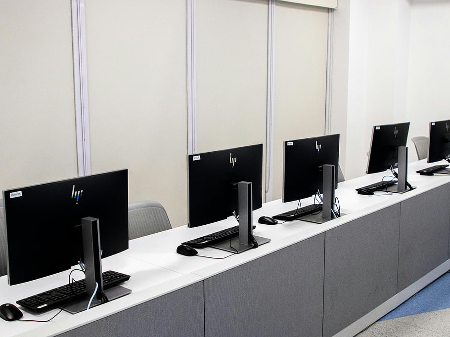 computers, monitors, minimalist office, open office space, empty computer desks, HP monitors, office setup, modern office, workspace design, computer stations, office technology