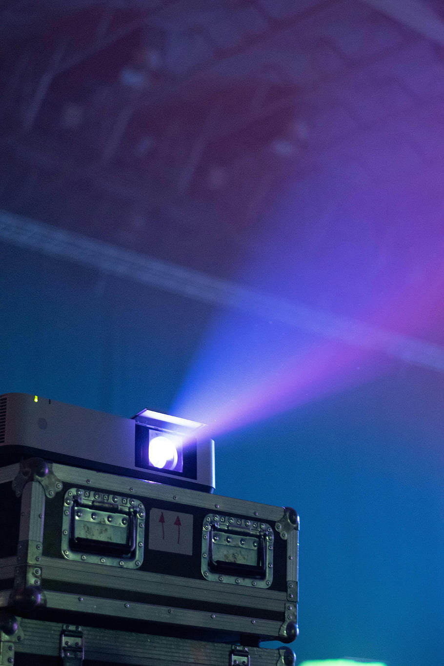projector light, vibrant light beam, stacked projector case, dark room, light projection, stage lighting, event setup, projector setup, light effects, event technology, projector beam