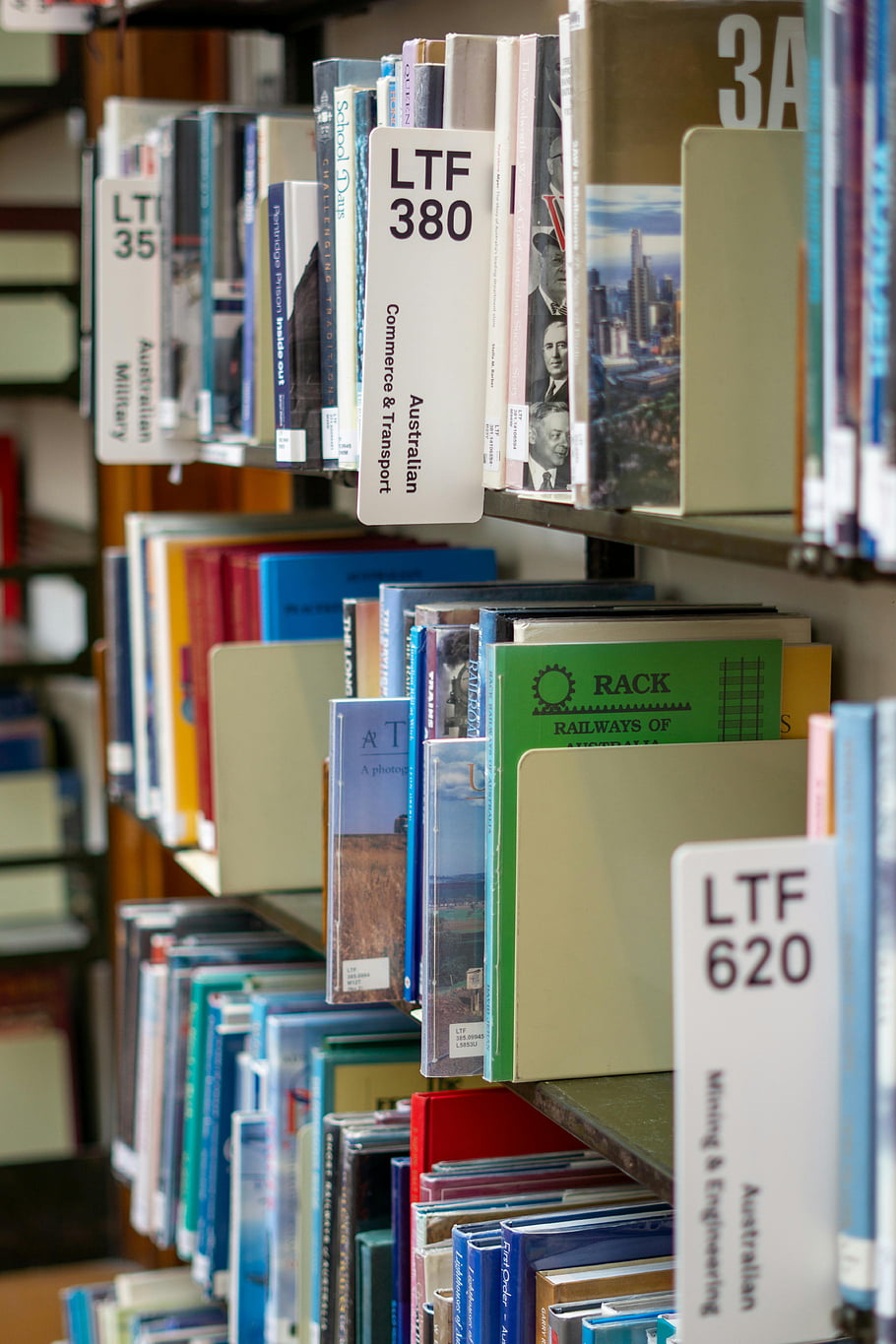 library bookshelf, Melbourne, diverse titles, close-up view, various books, Australian, railways, commerce transport, mining engineering, book organization, library shelves