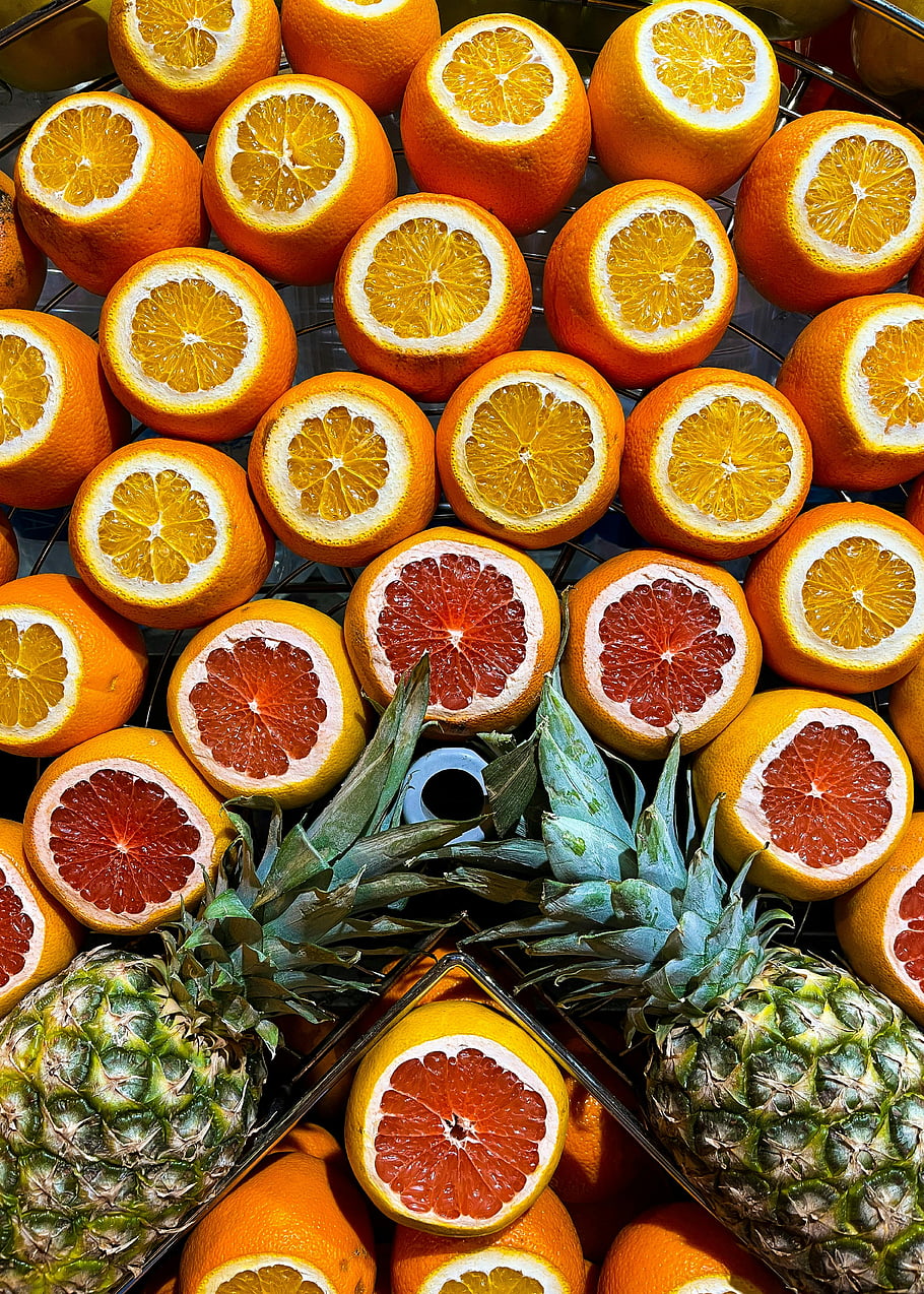 photograph, assorted, citrus, fruits, drinking glasses, salad, bowl, orange, juicer, pineapple, lemons