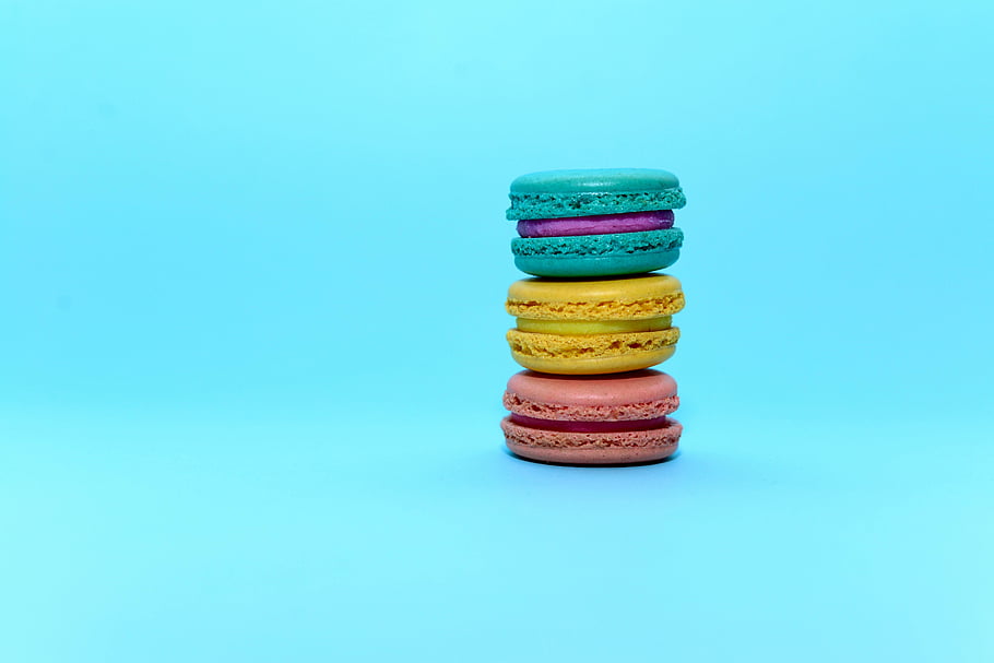 macarons, colorful macarons, stacked macarons, vibrant macarons, blue background, food photography, design, three macarons, macaron stack, colorful stack, solid blue background