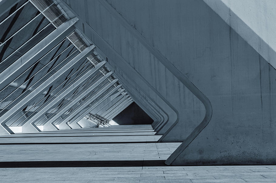 grayscale photo, concrete structure, modern architecture, geometric patterns, Valencia, City of Arts and Sciences, architectural design, urban photography, abstract architecture, concrete design, monochrome image