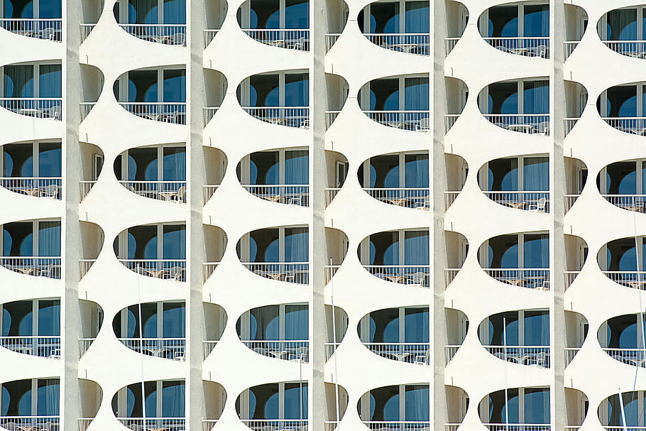 modern building exterior, geometric patterns, architectural design, modern architecture, building facade, blue windows, contemporary design, balcony architecture, abstract patterns