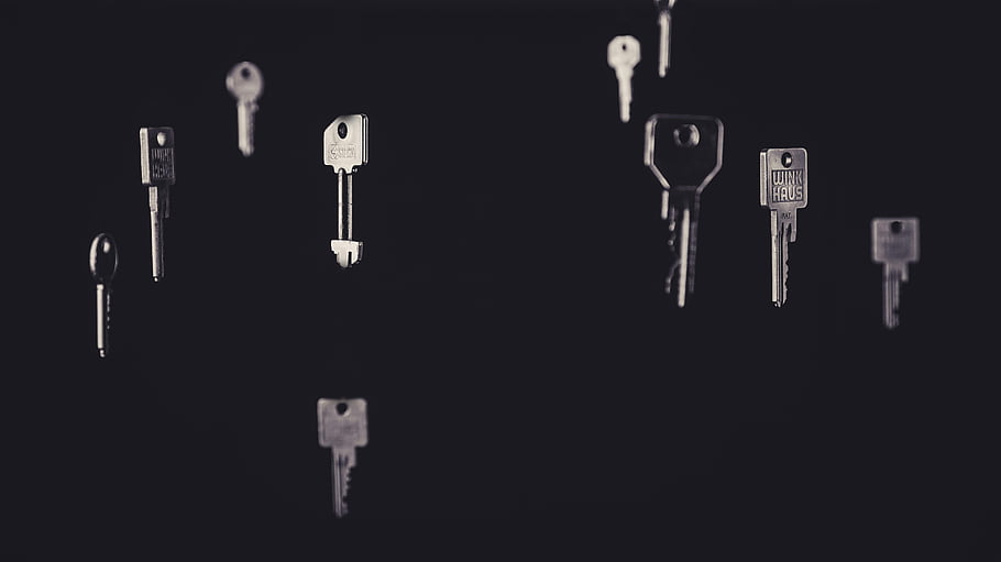 floating metallic keys, dark minimalist setup, artistic display, floating keys, minimalist setting, metallic keys, dark background, modern art, key art, minimalist art, dark art