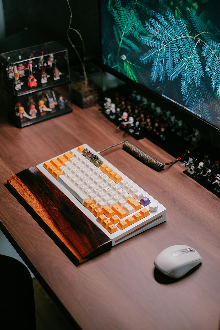 custom mechanical keyboard, mouse, stylish desk setup, decorative elements, computer desk, gaming setup, desk accessories, wooden desk, computer peripherals, ergonomic setup, desk organization