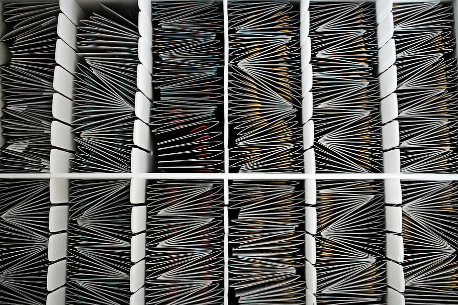 paper document organization, top view of folded papers, container with separators, organized documents, neatly organized documents, document separators, paper filing system, document storage, documents in a container.