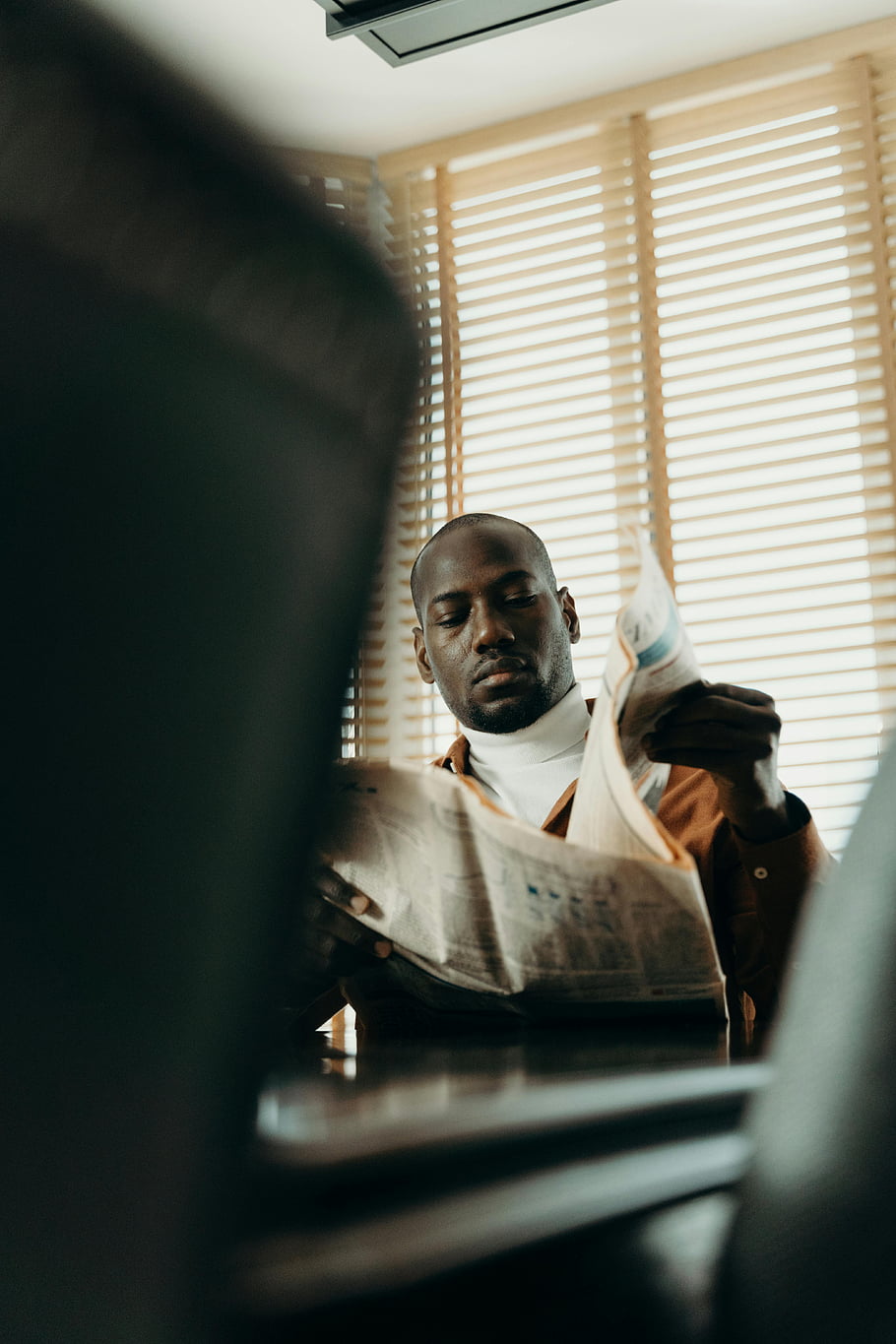 man reading newspaper, indoor setting, window blinds, table, newspaper reader, cozy atmosphere, morning routine, indoor photography, window light filtering through blinds.
