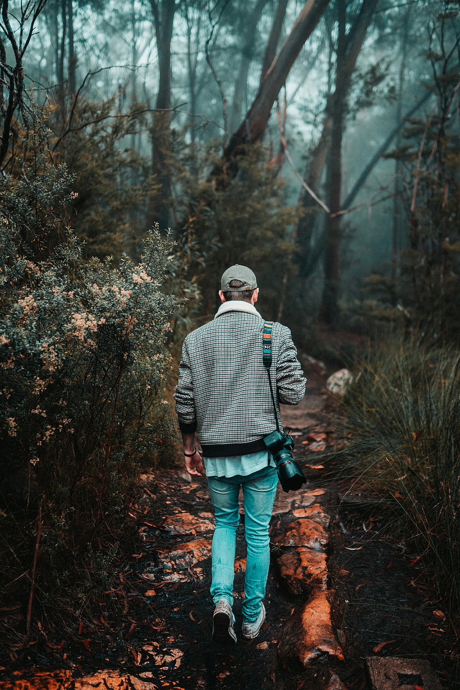 man with camera, forest, foggy forest, exploring nature, calm setting, walking through forest, man carrying camera, nature exploration, outdoor photography, forest path, man in forest