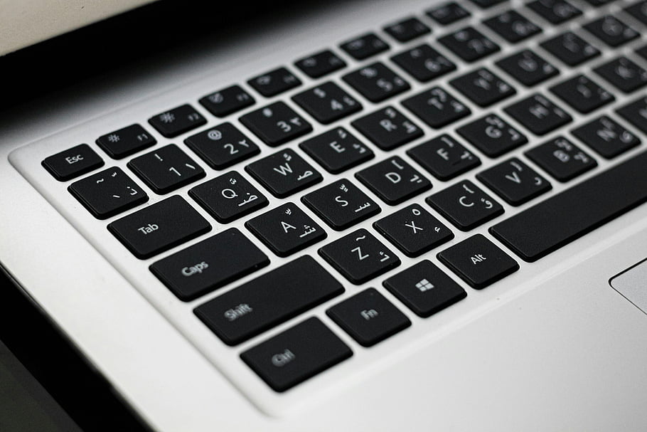 Arabic keyboard, English keyboard, bilingual keyboard, laptop keyboard, close-up, sleek design, efficient typing, Arabic letters, English letters, multi-language keyboard, laptop close-up