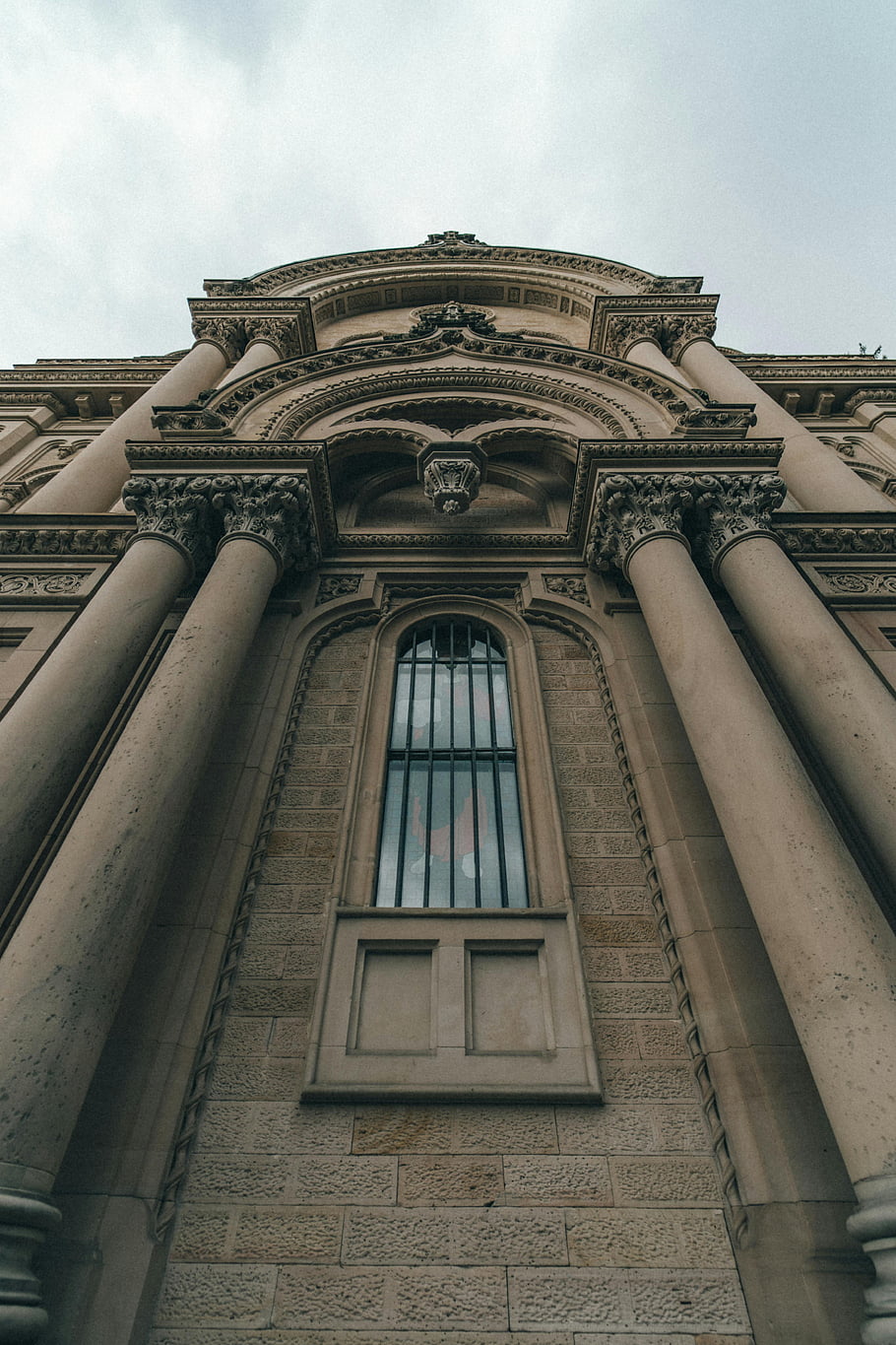 neoclassical building, gray concrete, arched window, impressive columns, low-angle view, building facade, architectural design, historical architecture, urban landscape, stone structure, classical style