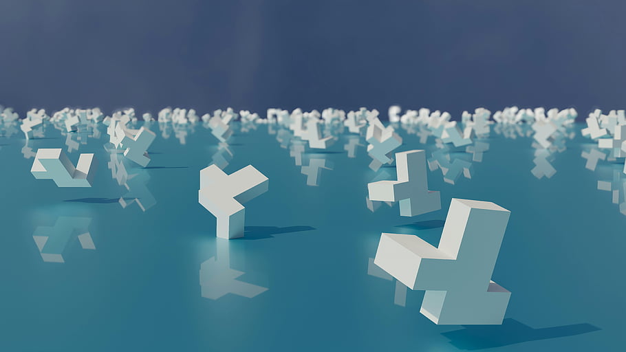 abstract floating shapes, 3D shapes, calm water, tranquil sea, serene digital art, abstract 3D art, floating objects, digital scene, abstract water scene, calm digital art, serene shapes
