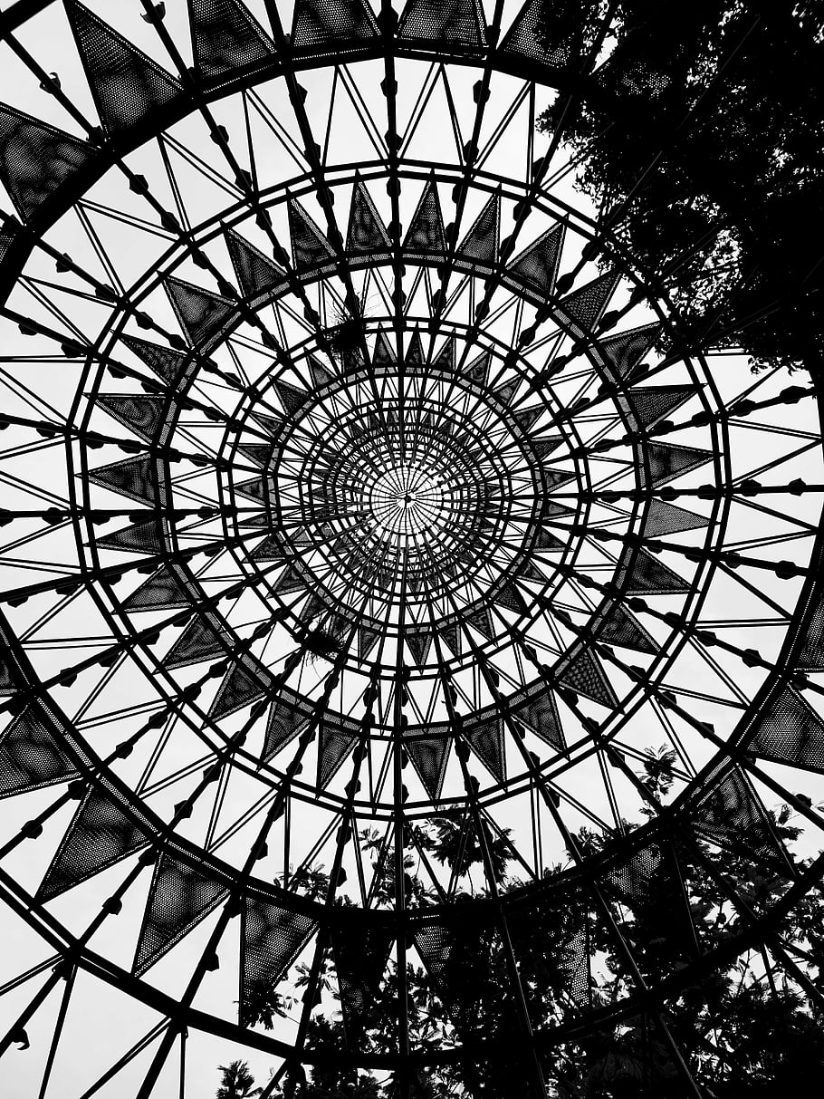 Steel Lattice Tower, geometric lattice structure, black and white, patterns, shapes, artistic view, circular design, architectural photography, structural engineering, monochrome, symmetry