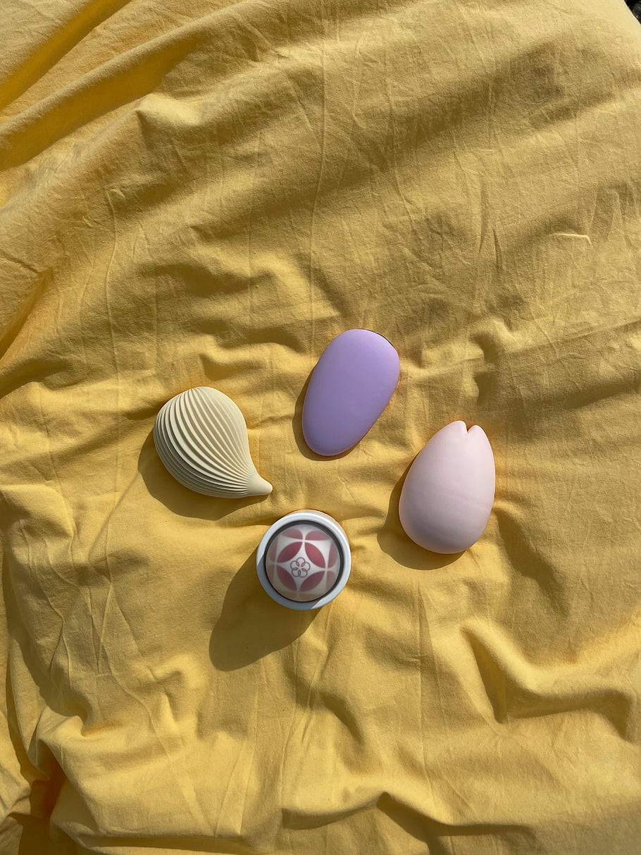 yellow fabric, diverse objects, natural light, bright yellow, four objects, decorative items, pastel colors, textured surface, soft shadows, minimalistic composition, still life photography