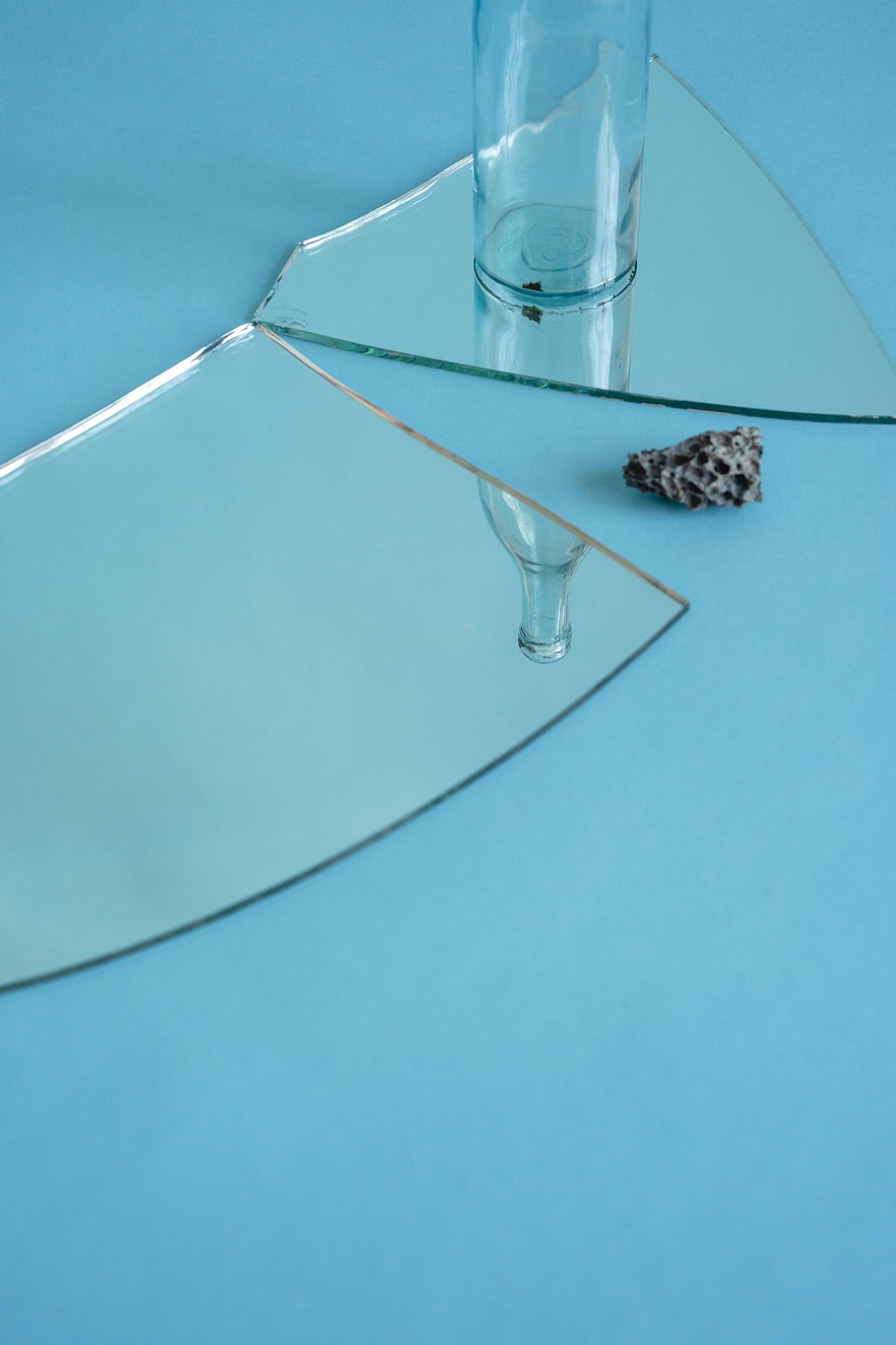 drinking glass, broken mirror, artistic still life, reflection, blue background, clear glass, mirror shards, shell, minimalistic composition, abstract art, modern art