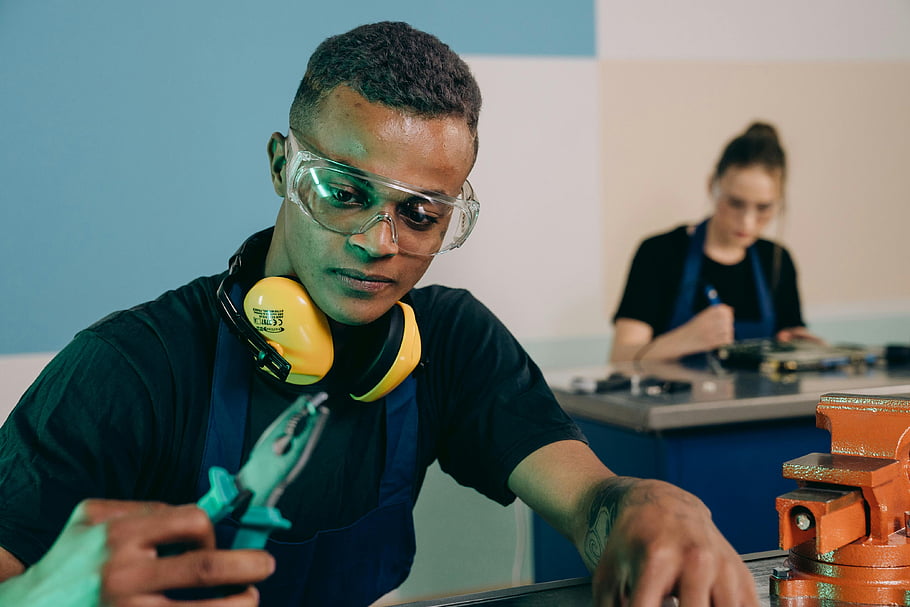 man in goggles, working, technicians, modern workshop, tools, safety goggles, protective equipment, workshop environment, industrial setting, focused work, collaboration