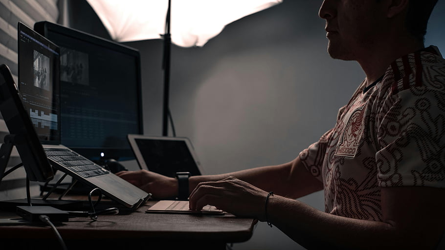 man using laptop, editing photos, multiple screens, desk, dim lighting, photo editing, workspace, computer setup, professional photographer, dark room, productivity
