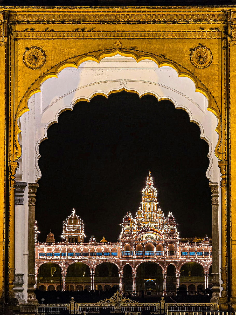 Mysore Palace, Illuminated Mysore Palace, Night View Mysore Palace, Ornate Archway, Mysore Palace at Night, Mysore Palace Lighting, Indian Architecture, Palace Illumination, Monument Frame