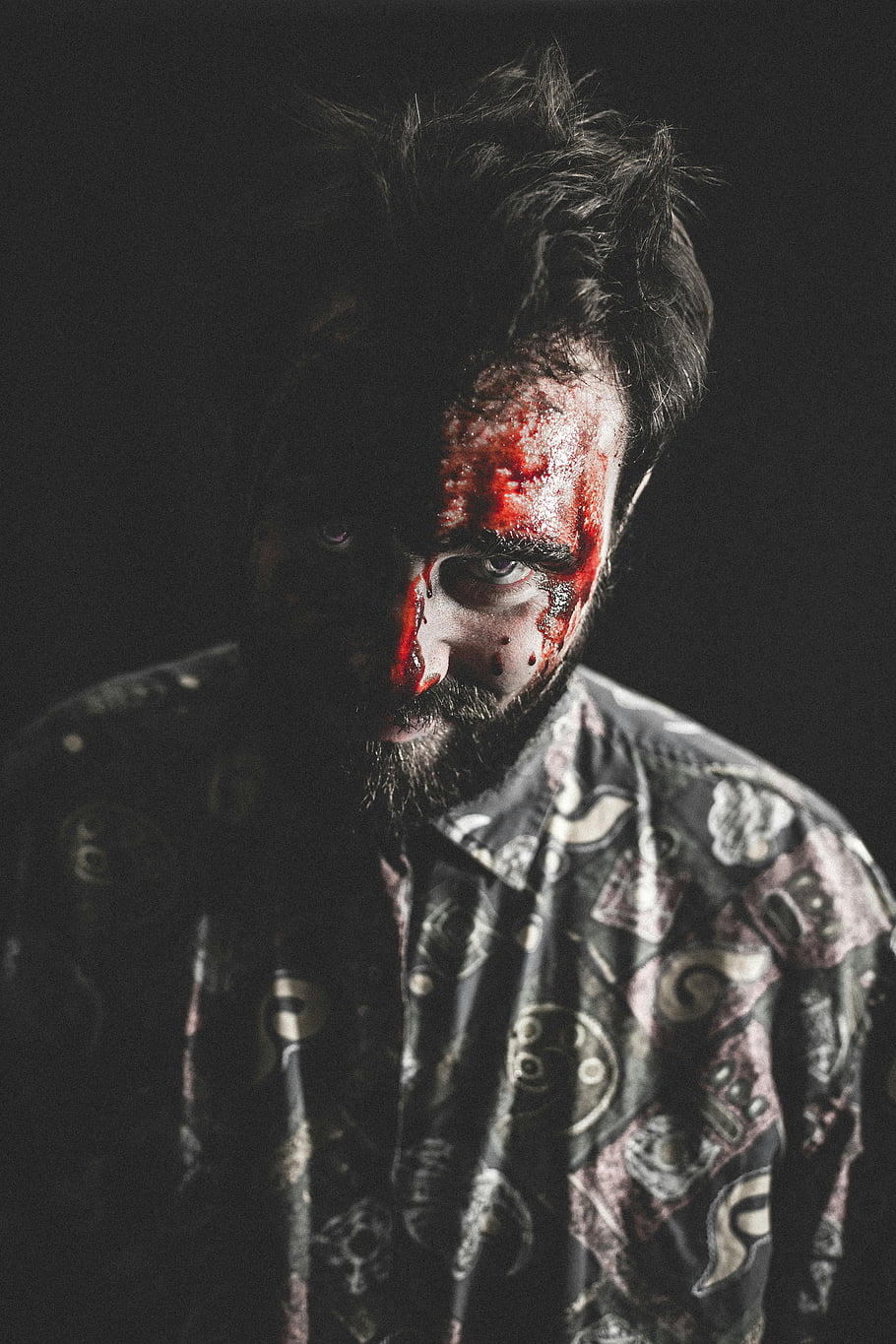 man's face, horror makeup, dark background, zombie effect, blood splatter, dramatic lighting, patterned shirt, intense expression, halloween costume, spooky look, eerie atmosphere