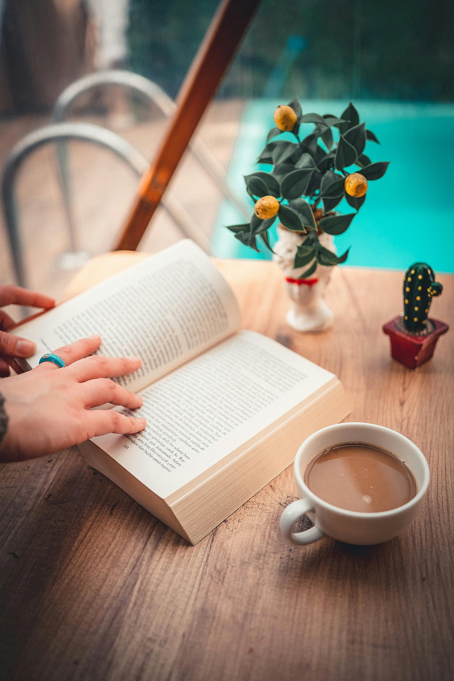 open book, cup of coffee, poolside, relaxing scene, tranquil afternoon, table by the pool, poolside setup, coffee and book, outdoor reading, poolside relaxation, wooden table