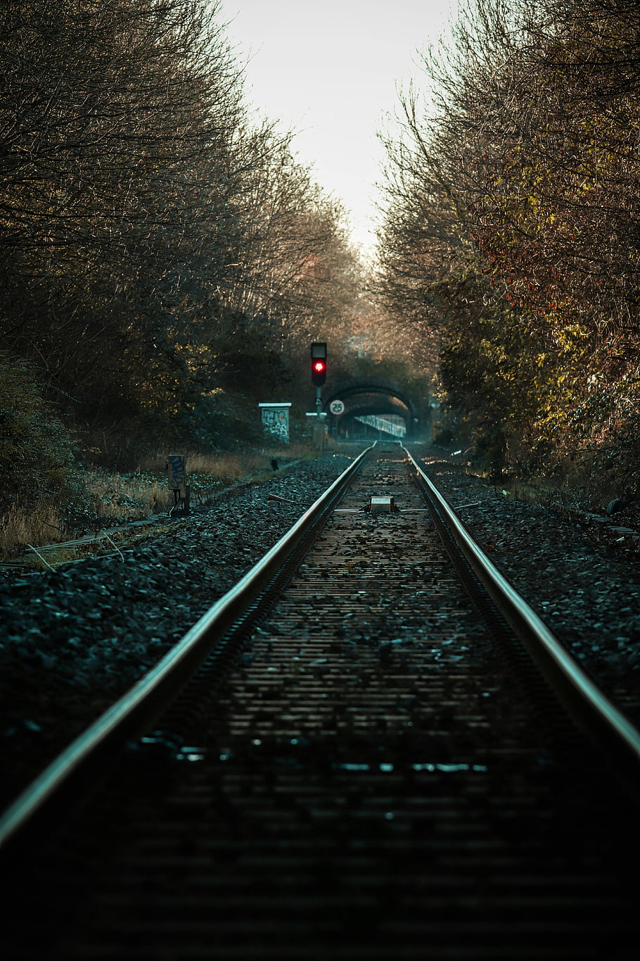 railway tracks, bare trees, atmospheric scene, stop light, barren trees, train tracks, forest railway, railway tunnel, autumn trees, railway signal, railway landscape