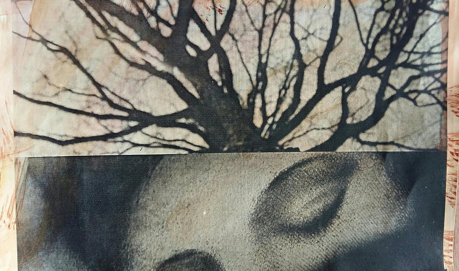 abstract art, painting, face, tree branches, harmonious blend, close-up, artwork, abstract artwork, face and branches, artistic composition, nature and human