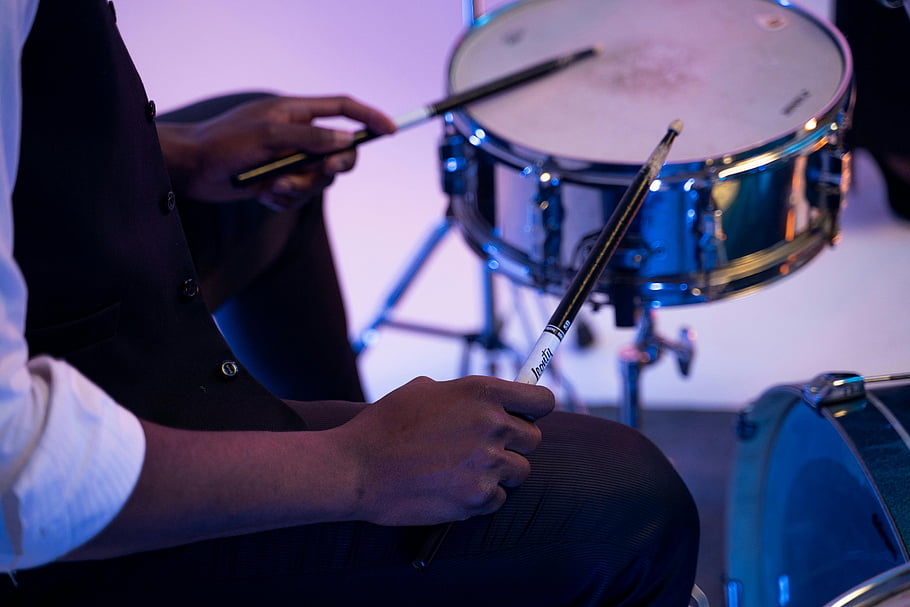 batería, kit de batería, de cerca, manos, iluminación vibrante, baquetas, tambor, actuación musical, música en vivo, tamborilear, percusión -