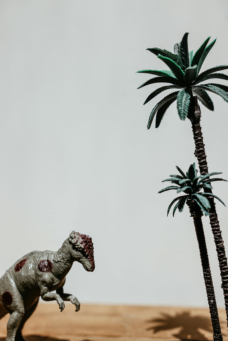 Dinosaurio de plástico, palmeras, figurines, configuración minimalista, juego de sombras, dinosaurio de juguete, palmeras de juguete, escena en miniatura, modelo de dinosaurio, modelo de palmera, objetos decorativos