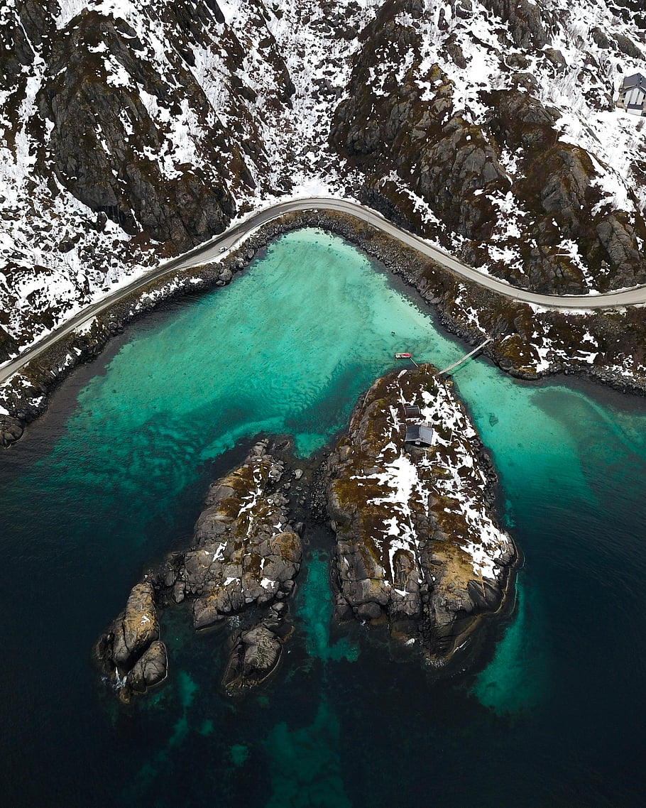 vista aérea, isla, montañas, skaland, Noruega, montañas dramáticas, agua clara, vista impresionante, paisaje costero, paisaje natural, vista de fiordo -