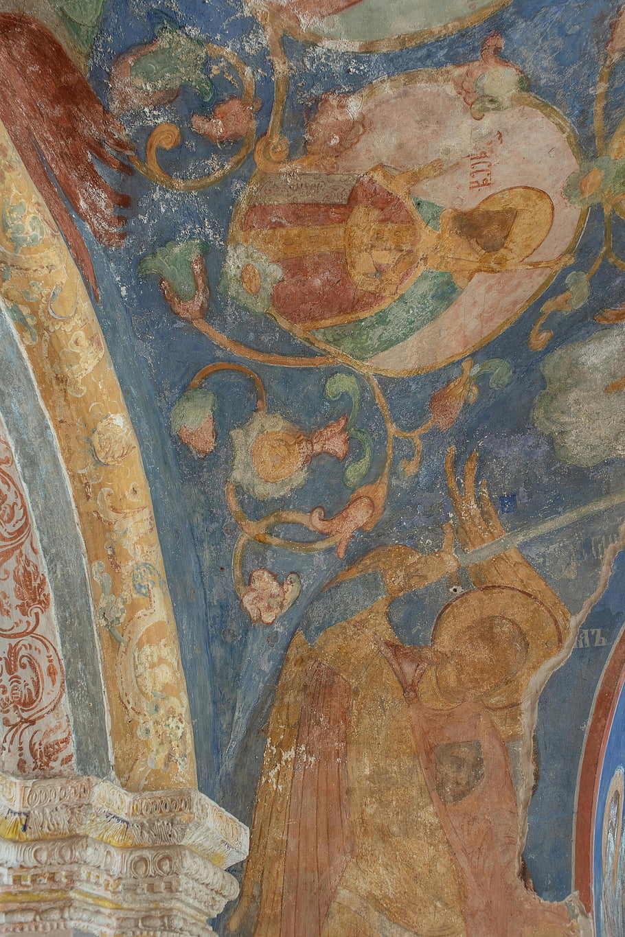 viharvert freskók, történelmi vallási freskó, öregített mennyezet, klasszikus építészet, viharvert festék, történelmi művészet, vallási művészet, mennyezeti freskó, klasszikus freskó, régi freskó, történelmi mennyezet