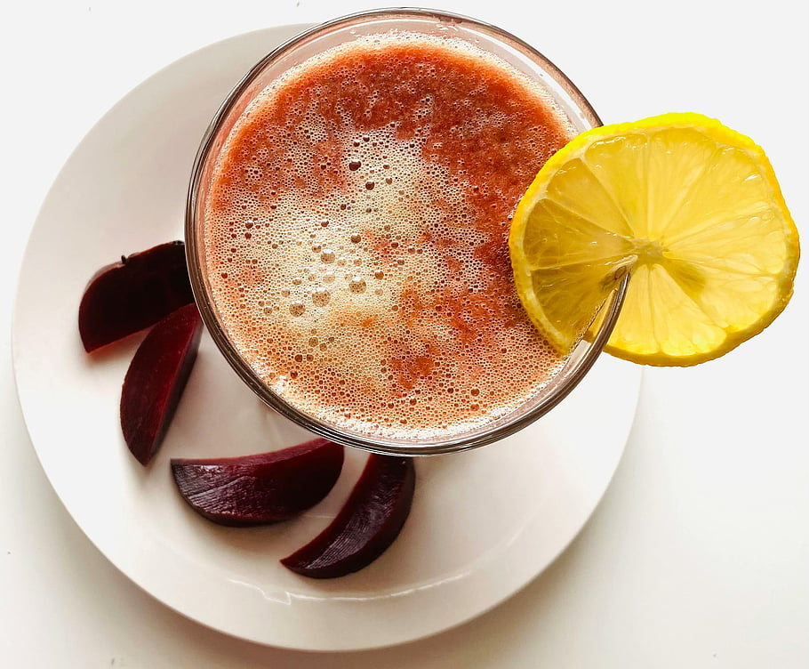 cékla lé, citrom körettel, frissítő egészségitalok, felülnézet, vibráló ital, citromos szelet, céklaszeletek, egészséges ital, citromlé, savanyúság és citrom, felülről lefelé lövés