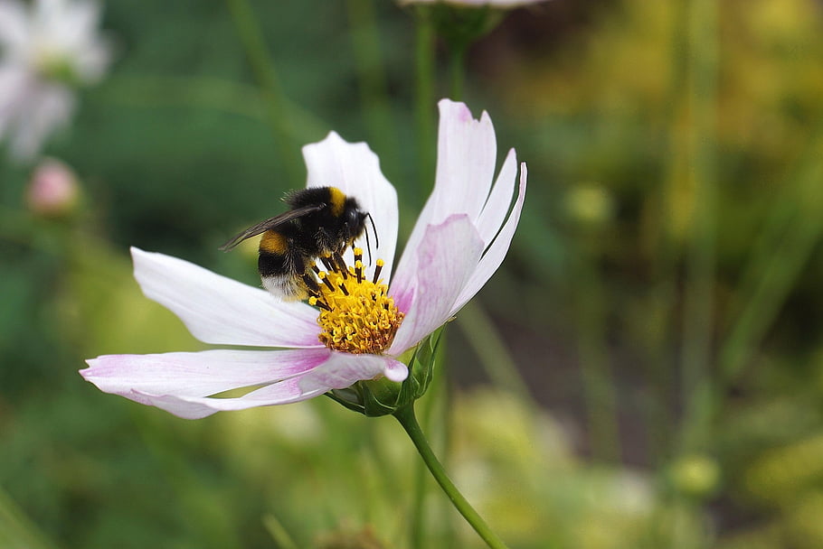 kerti kozmosz, virág, háziméh, rovar, beporzás, növények, mexikói aster, kozmosz bipinnatus, világegyetem, hd háttérkép, rózsaszín virág