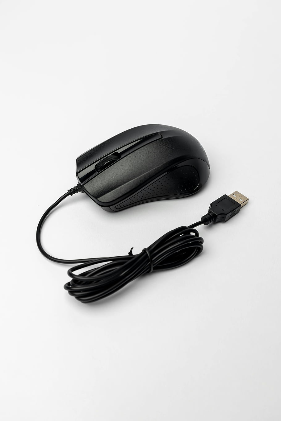 mouse komputer hitam, Mouse berkabel USB, latar belakang putih, konten teknologi, foto close-up, tikus hitam, periferal komputer, mouse berkabel, konektor usb, produk teknologi, hitam dan putih