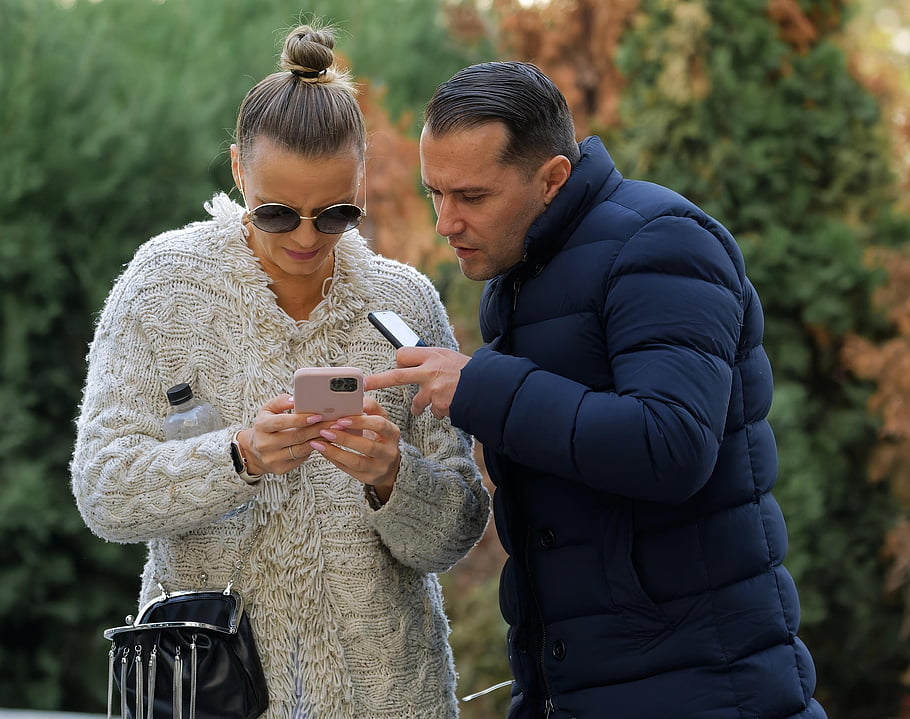 giovane coppia, uomo, donna, persone, analizzare, cercare, guardare, insieme, smartphone, all'aperto, stile di vita