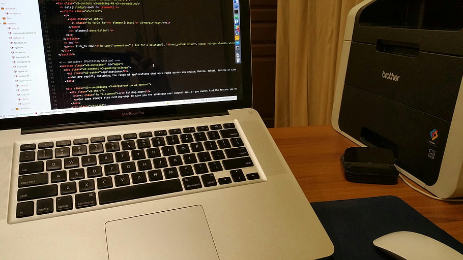 codifica, Macbook Pro, codice sorgente, ufficio a casa, scrivania, Software, sviluppo, fratello, lavoro, html, legna