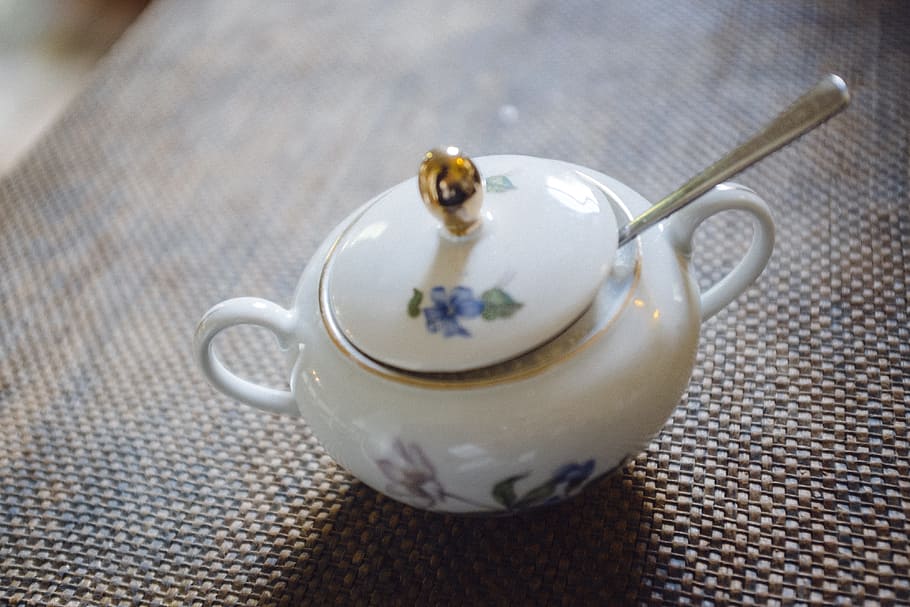 zucchero, zuccheriera, cucchiaino, l'ora del tè, vista da vicino, zucchero bianco, dolcificante, accessori per il tè, cucchiaio di zucchero, Preparazione del tè, piatto di zucchero