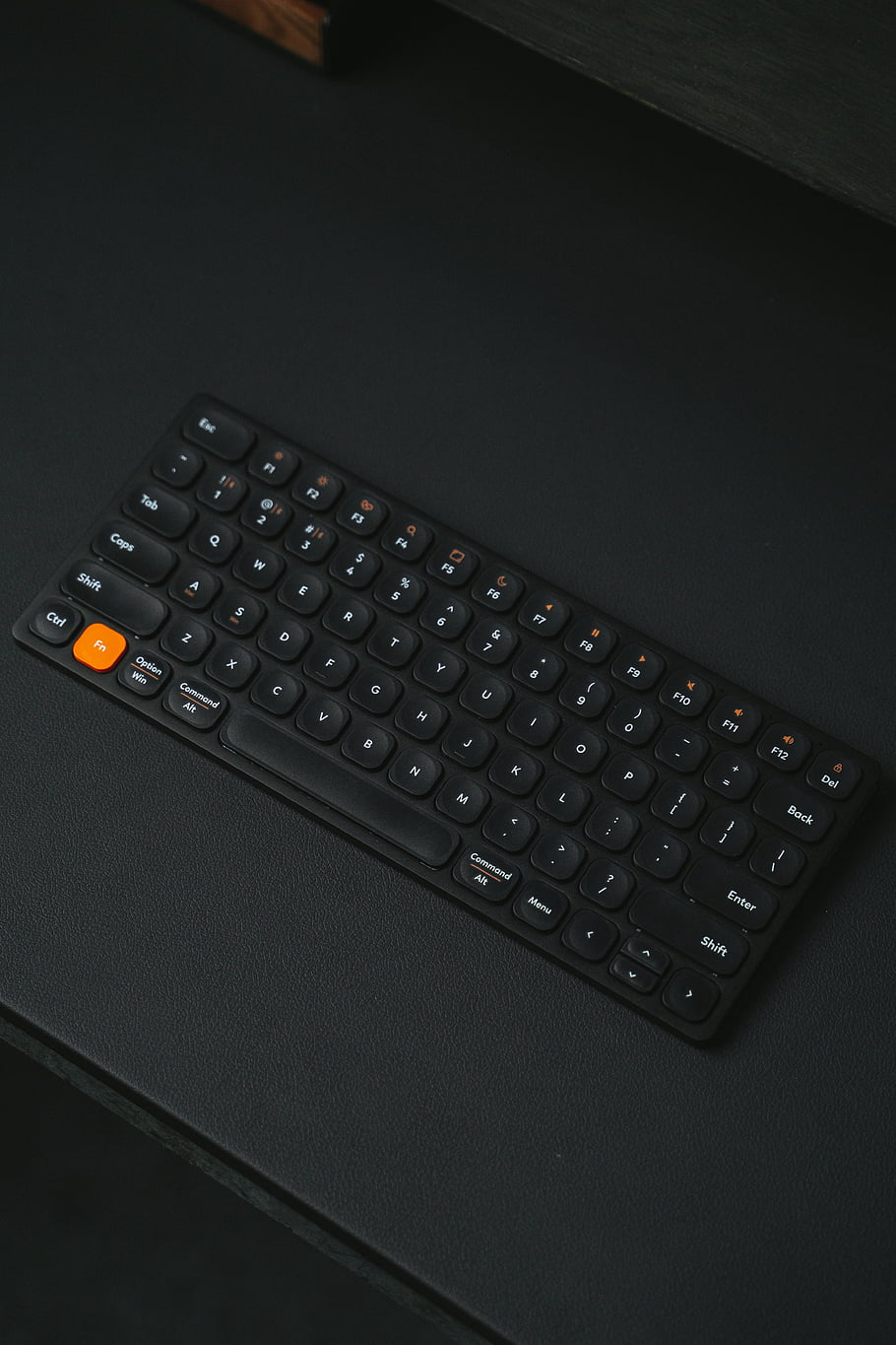ワイヤレスキーボード、 洗練された黒のキーボード、 オレンジ色のボタン、 技術セットアップ、 暗い背景、 閉じる、 モダンなキーボード、 コンパクトキーボード、 ミニマリストデザイン、 無線技術、 キーボードアクセサリー -