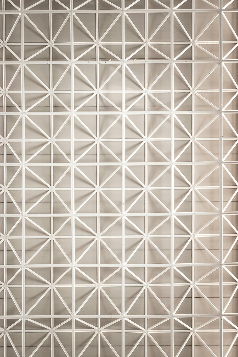 幾何学的な天井、 三角形のパターン、 近代建築、 対称設計、 天井構造、 繰り返される三角形、 建築デザイン、 幾何学模様、 モダンな天井、 三角天井、 対称的な天井 -