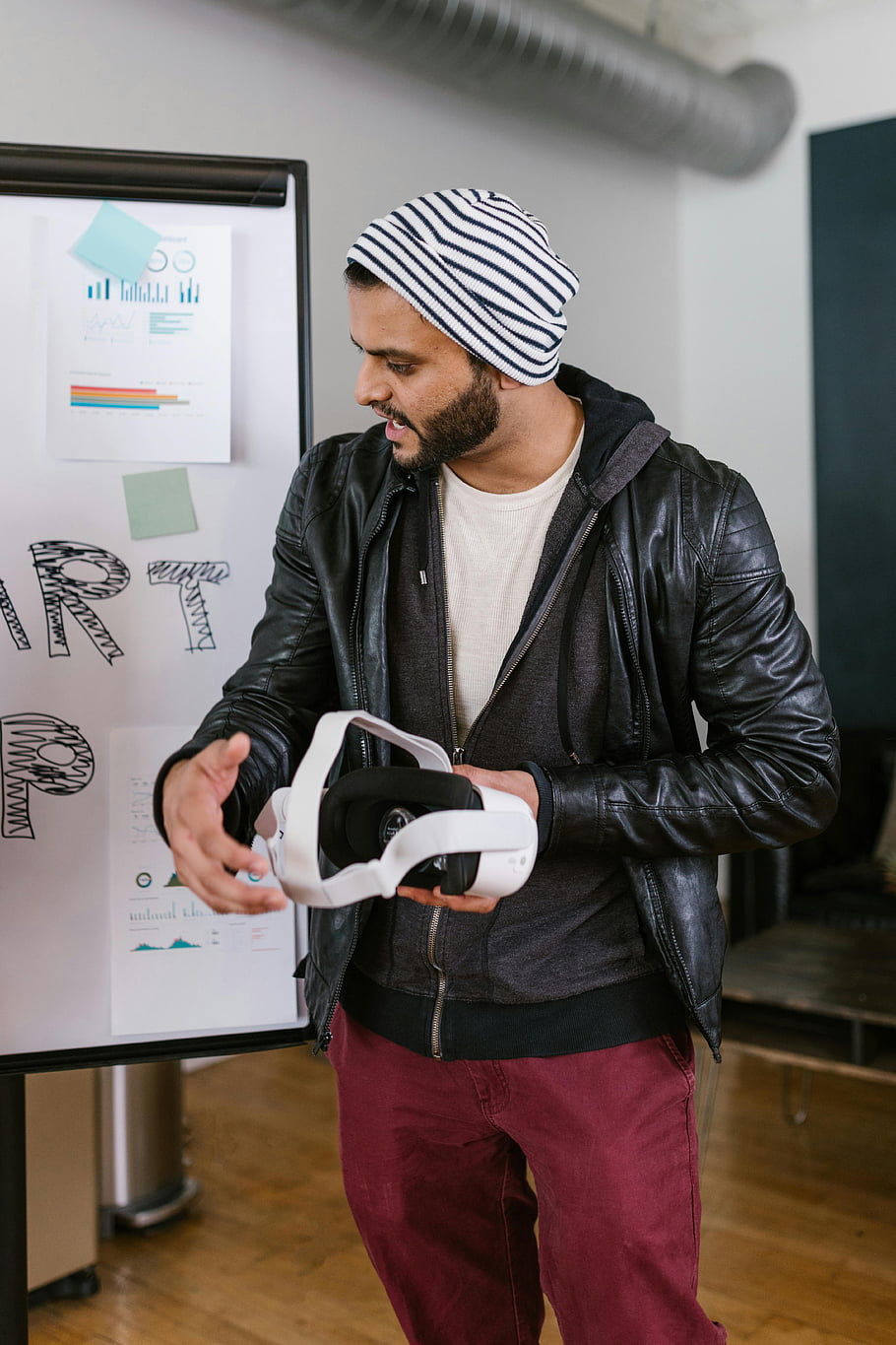 革のジャケットの男、 VRヘッドセット、 スタートアップオフィス、 技術プレゼンテーション、 革新、 プレゼンテーション、 バーチャルリアリティ、 オフィス設定、 近代的なオフィス、 VRヘッドセットを装着した男性 -