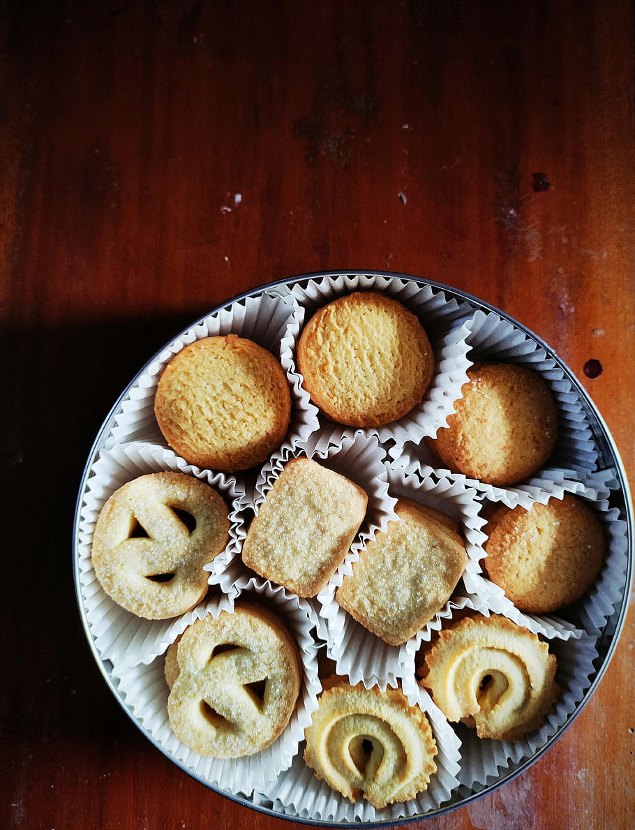 デンマークバタークッキー、 丸いブリキの箱、 木製テーブル、 さまざまなクッキー、 きれいに整えられた、 バタークッキー、 丸箱、 木の表面、 各種クッキー、 クッキー缶、 デンマークのクッキー -
