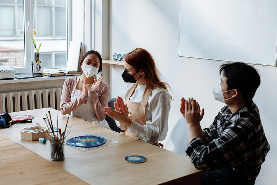 手をたたく、 仮面アーティスト、 屋内設定、 新しいノーマル、 共同アート、 創造的な環境、 グループアクティビティ、 フェイスマスク、 アート制作、 チームワーク、 安全対策 -