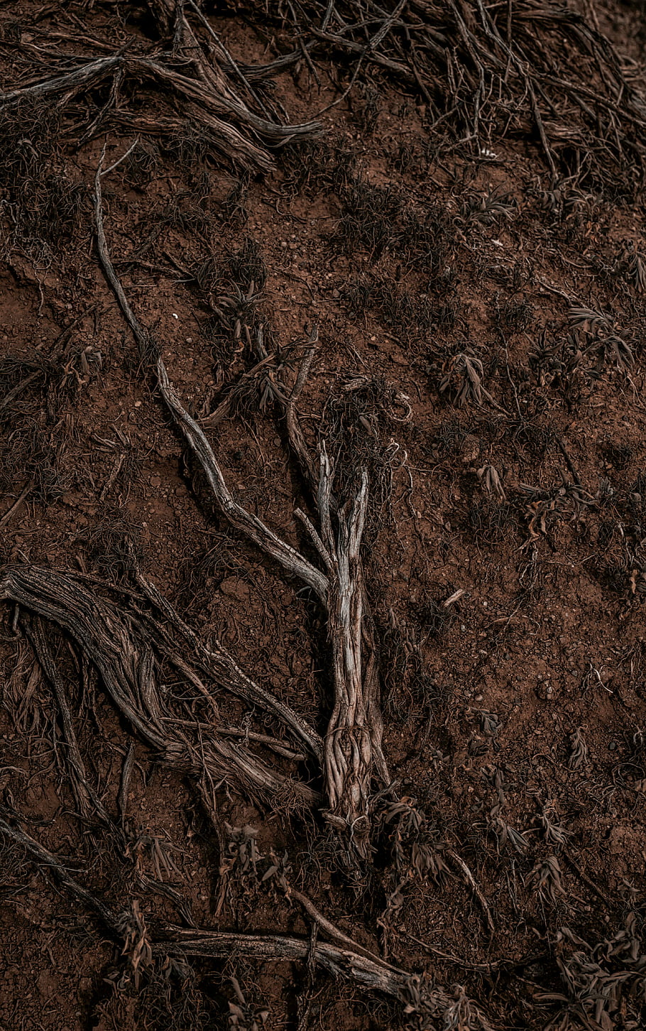 泥の中の根、 乾いた根、 豊かな土壌、 複雑な模様、 自然のパターン、 絡み合った根、 詳細なビュー、 自然な風合い、 土壌テクスチャ、 根の構造、 素朴なトーン -