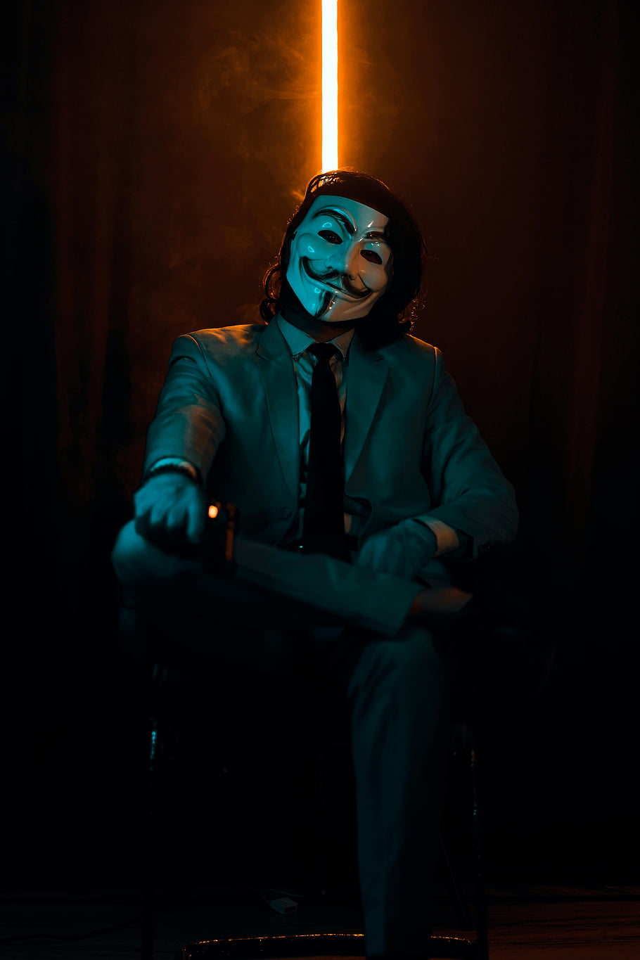 ガイフォークスマスク、 スタジオ撮影、 スーツを着た男、 座像、 暗い設定、 劇的な照明、 匿名マスク、 vendettaの場合はv、 スーツとマスク、 スタジオポートレート、 劇的な肖像画 -
