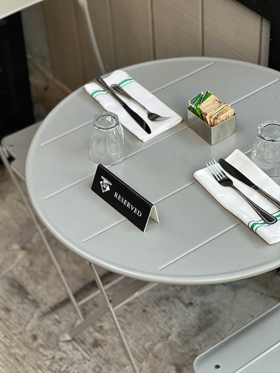 小さな予約テーブル、 レストランのテーブル、 きちんとセッティングされたテーブル、 カトラリー、 ナプキン、 予約サイン、 お食事の準備が整いました、 ダイニングテーブル、 レストランの設定、 テーブル設定、 屋外ダイニング -
