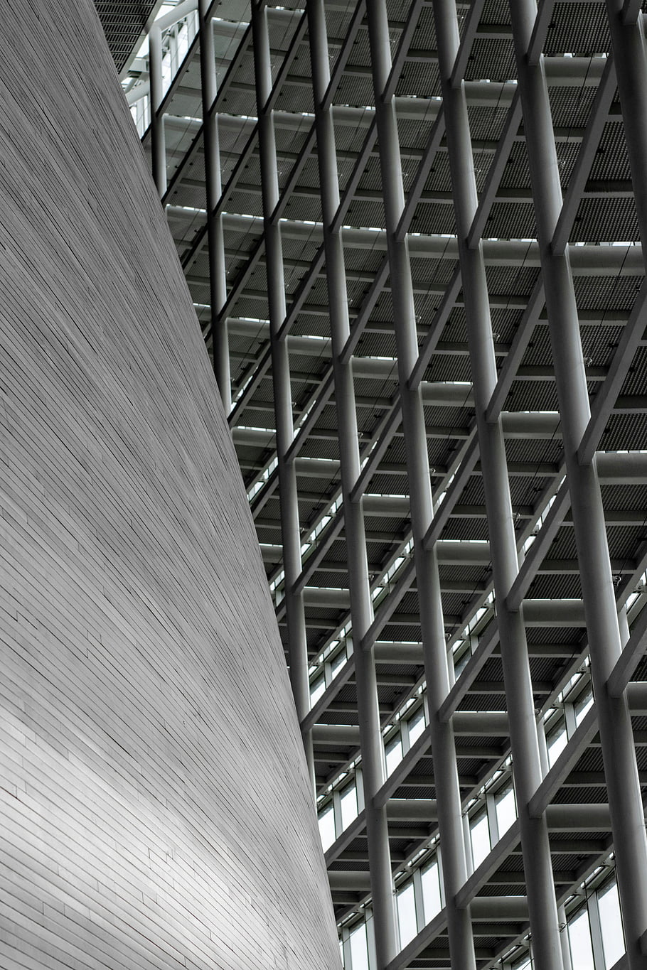 近代建築、 抽象的なビュー、 湾曲したガラス、 鉄骨造、 グレーの天井、 窓、 建築デザイン、 現代建築、 構造線、 幾何学模様、 アーバンデザイン -