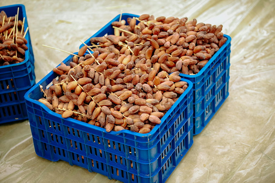 대추로 가득 찬 바구니, 신선한 대추 상자, 비스크라 시장, 알제리, 현지 농산물, 새로운 날짜, 알제리 데이트, 날짜 표시, 푸른 상자, 데이트 마켓