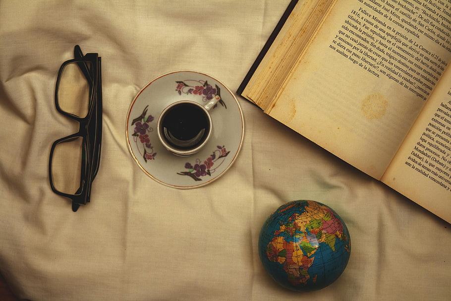 커피, 책 공개 시험, 안경, 지구, 천 배경, 오버 헤드 뷰, 편안한 장면, 빈티지 스타일, 학습 설정, 독서 시간, 아늑한 분위기