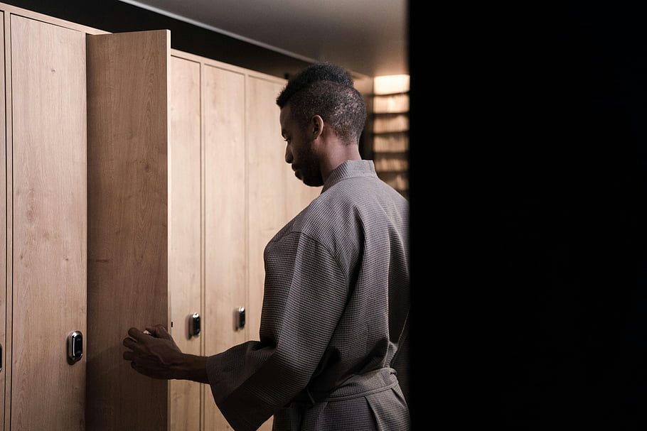 목욕가운을 입은 남자, 라커룸, 현대 스파, 고요한 설정, 사물함 사용, 목욕 가운, 스파 설정, 사물함, 남자, 현대, 고요한