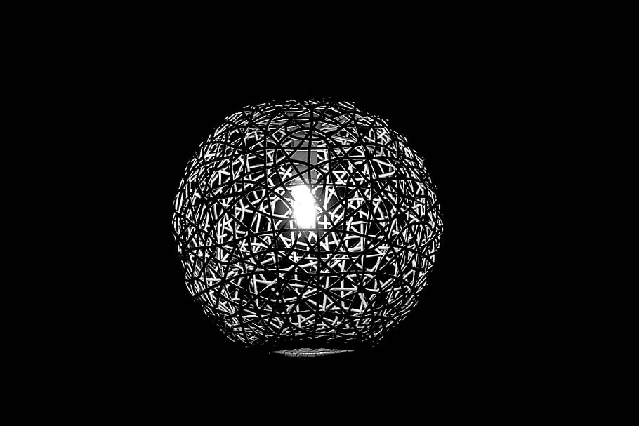 흰 공, 스틱, 검은색 타일 벽, 현대적인 흰색 가로등, 기하학적 시각 효과, 대조, 미니멀리스트 디자인, 현대 조명, 구형 램프, 검정색과 흰색, 기하학 무늬